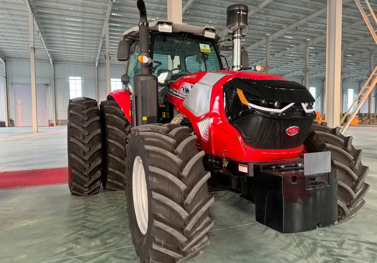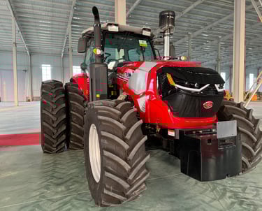 A close-up of a large agricultural machine with the branding visible, displaying sturdy tires resting on a grassy field under a partly cloudy sky. The machinery appears robust, equipped for fieldwork.